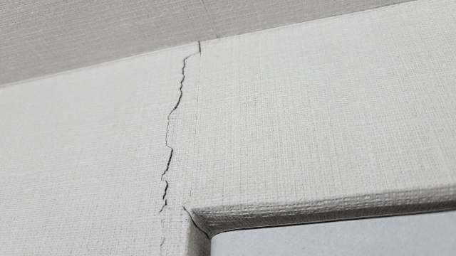 建物は地震のほか、近隣道路を走行する車両の振動などによって常にわずかな影響を受けています。また、下地に使用されている木材の乾燥収縮も壁紙に負荷をかけます。特に壁の角やドア・窓の周囲、パーテーションとの接合部は力が集中しやすいため、ひび割れが頻発する箇所となります。