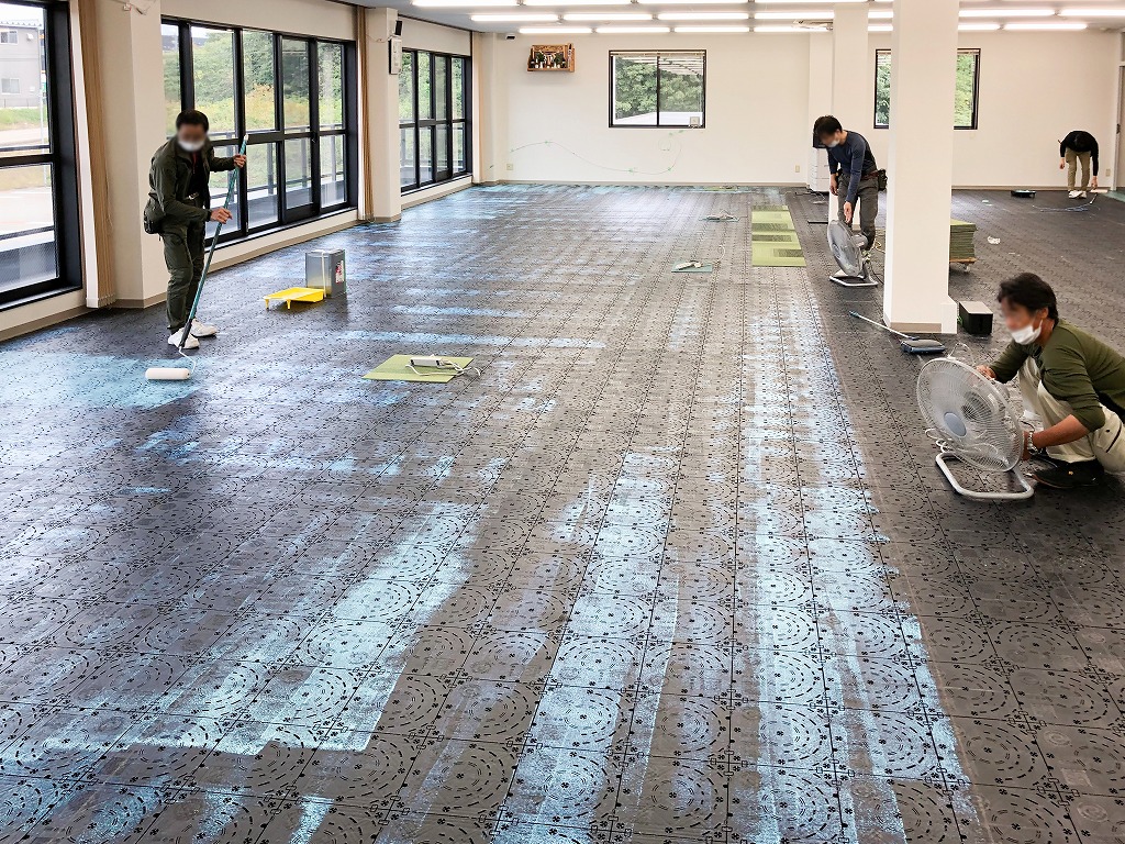 タイルカーペットを貼る前に、まず墨出しを行い、OAフロアの二重床の上から糊を塗布していきます。