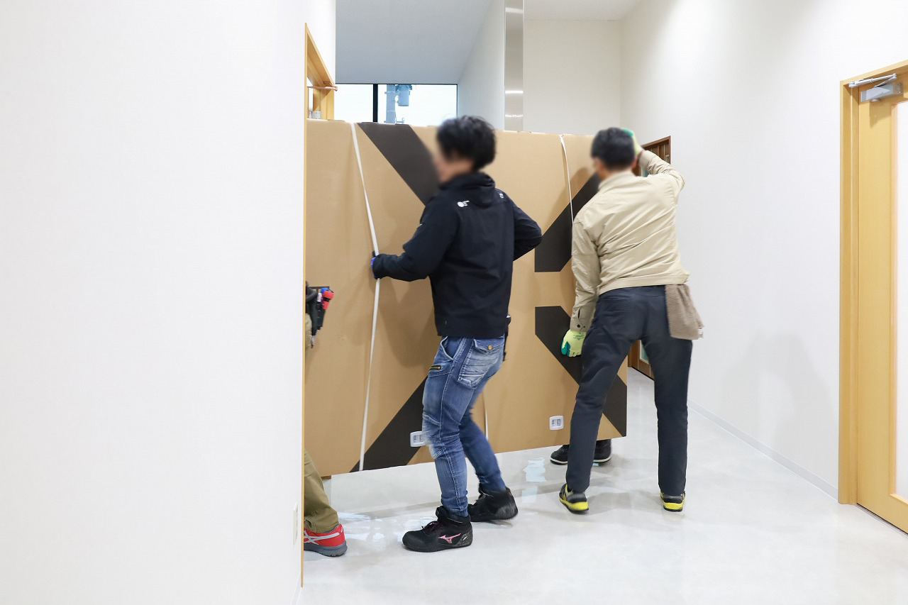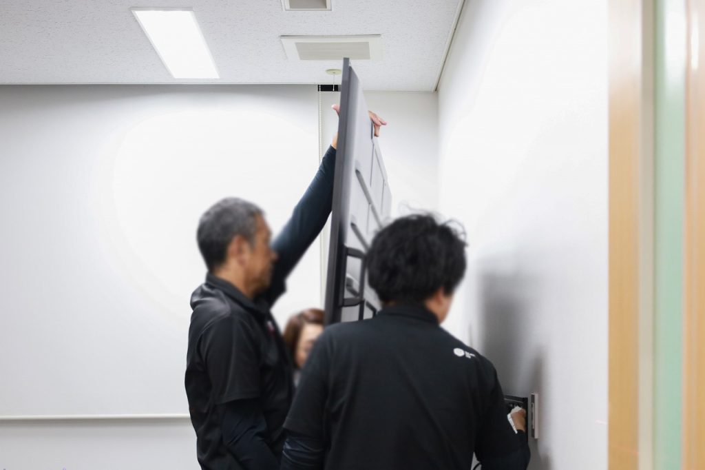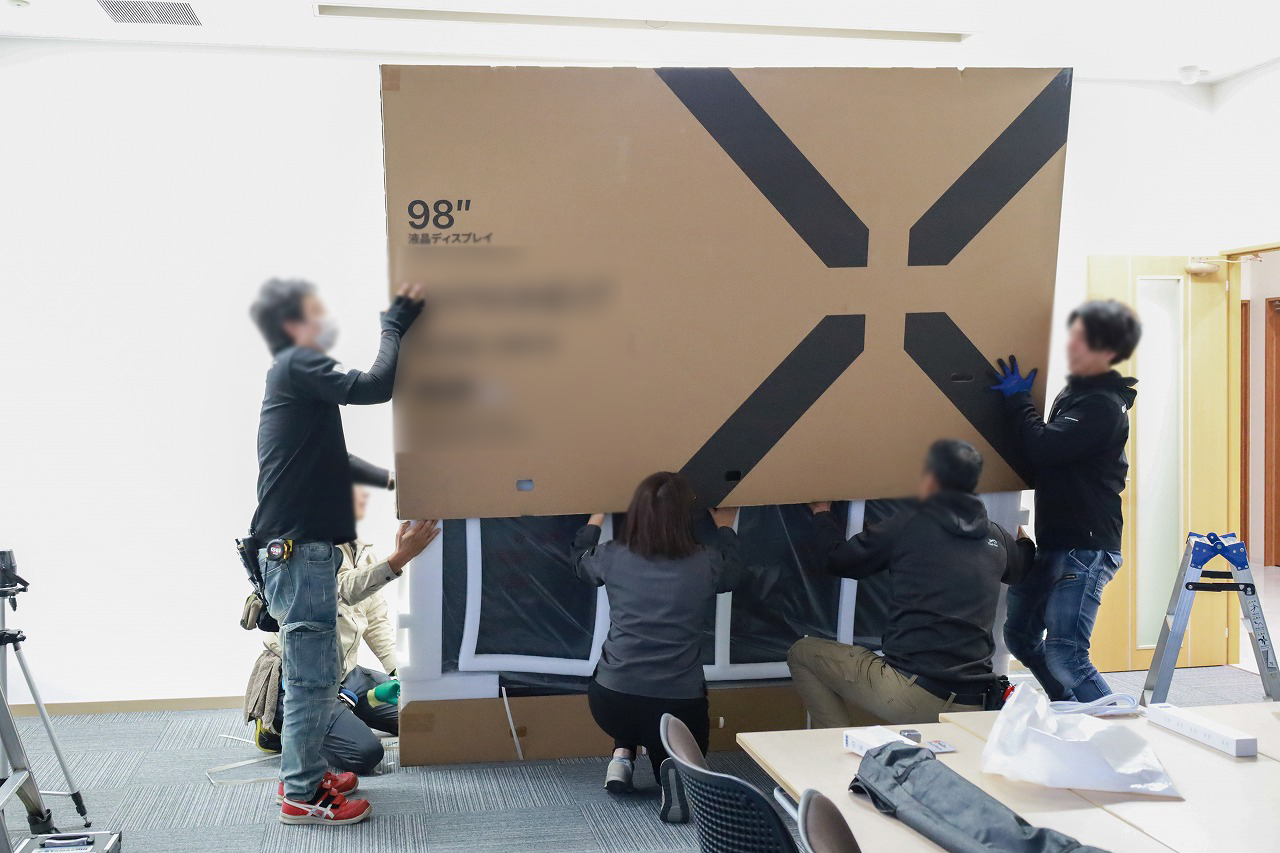 弊社ではこれまで多くのモニターを納入してきましたが、今回の98インチは過去最大サイズの大画面モニターでした。高さは130cm超、幅は2mを超えるため、設置場所の2階まで運ぶ際は5人がかりでの搬入となりました。箱から本体を取り出す作業も一苦労で、その迫力を実感できる搬入作業となりました。