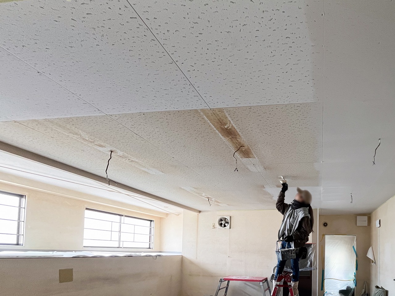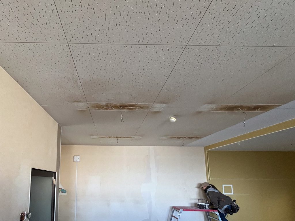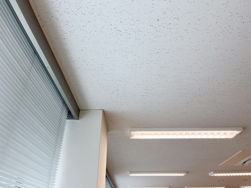 増床した事務所の天井改修|蛍光灯の熱で変色した天井塗装をリニューアル