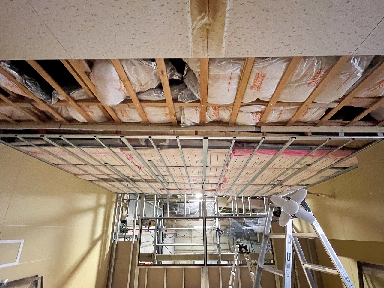 まずは軽量鉄骨を天井に固定し、間に断熱材を挟み込みます。