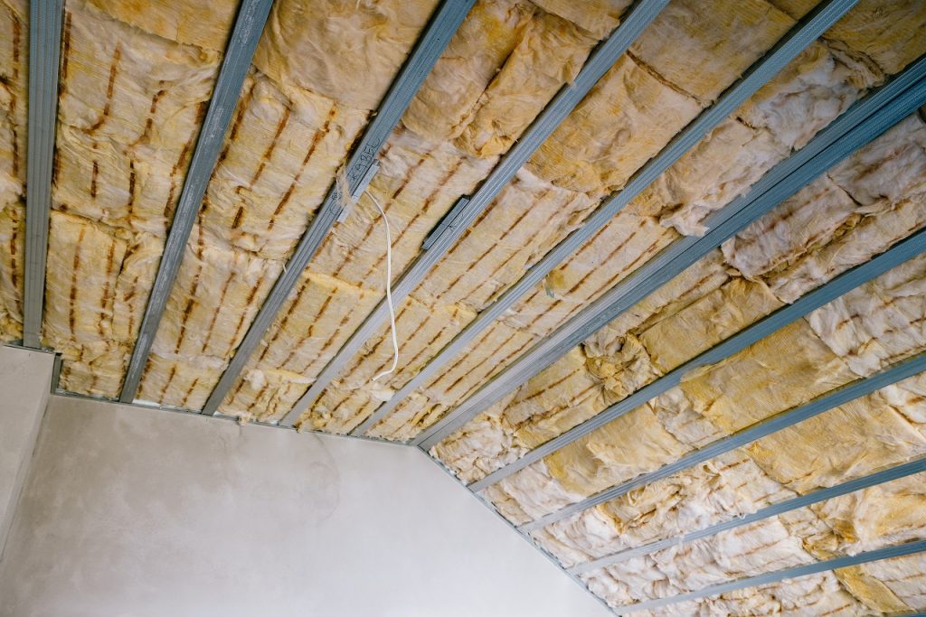 間仕切り内部のすき間を埋めるようにグラスウールを施工することで、